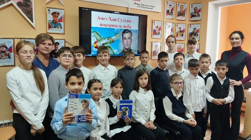 В беседе «Летать, что бы жить! Жить, чтобы летать» библиотекари рассказали биографию и интересные факты из жизни легендарного лётчика. Проинформировали, что во время Великой Отечественной войны Амет-Хан Султан совершил более 600 боевых вылетов, лично сбил 30 и в составе группы – 19 вражеских самолетов, участвовал в сражениях на различных фронтах, включая Сталинградскую и Курскую битвы. Большой интерес ребят проявился к демонстрации видео «Воздушные асы ХХ века».
