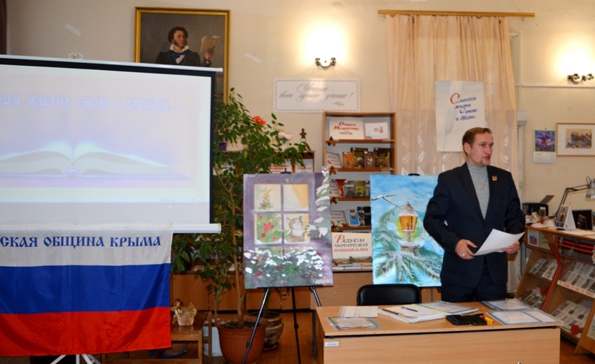 6 декабря в читальном зале ЦГБ им. А. С. Пушкина, в рамках Крымского культурного общества «Таврика», совместно с Симферопольской городской организацией Русской общины Крыма, состоялась итоговая годовая творческая встреча «Слагая жизнь свою в стихи…», посвященная Году защитника Отечества и предстоящим новогодним и рождественским праздникам.