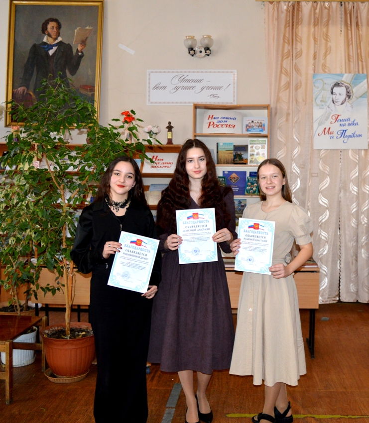 Стихи Александра Сергеевича Пушкина продекламировали студенты Театрального колледжа ГБОУ ВО РК «КУКИиТ»: Анастасия Денисова, Анастасия Исакова, Диана Водопьянова (преподаватель Юлия Белоусова).