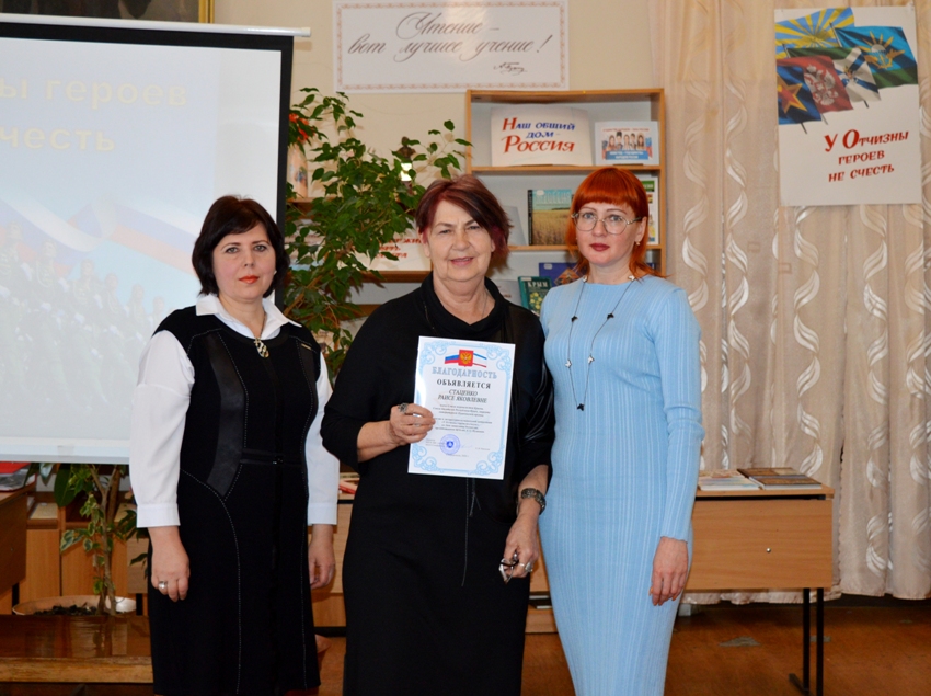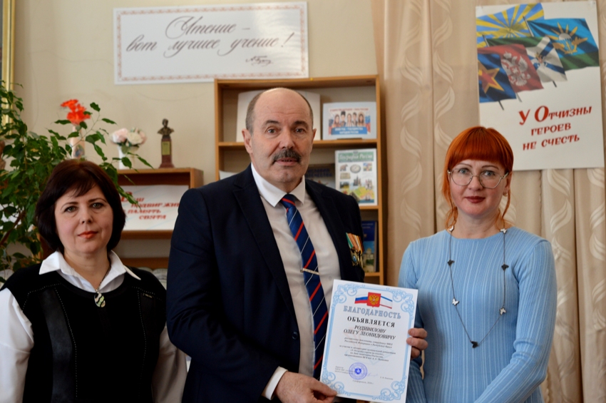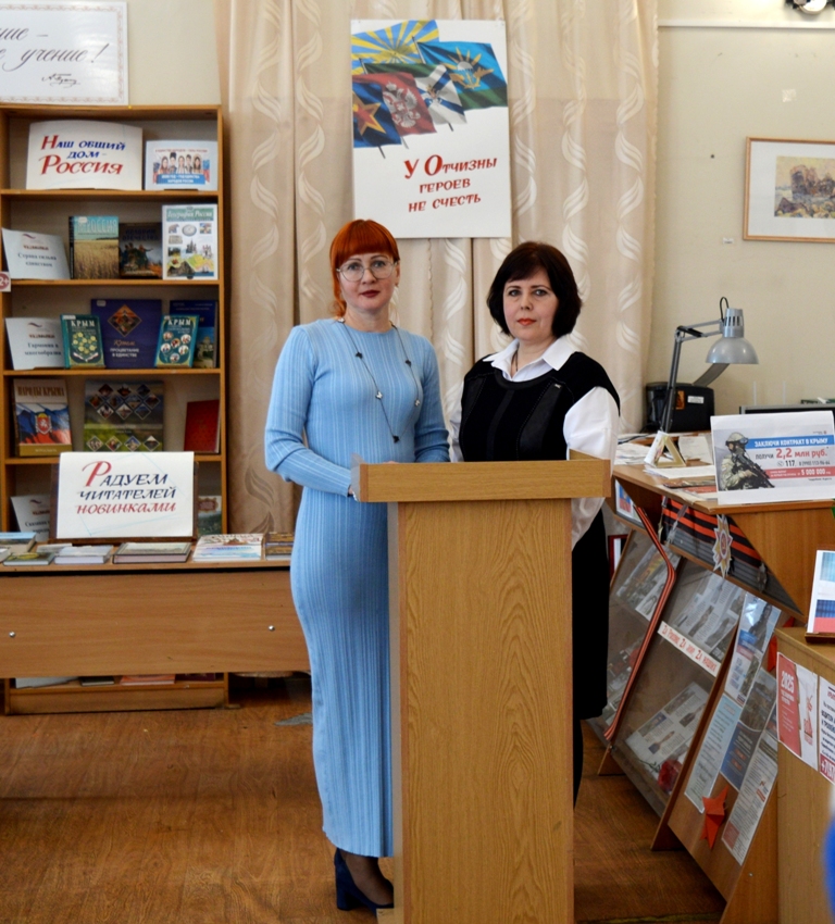 Ведущие встречи, сотрудники читального зала Елена Плахоцкая и Екатерина Катаева, рассказали об истории праздника, продекламировав стихотворения патриотического содержания. Вниманию гостей был представлен арт-объект «Zа Россию, Zа мир, Zа наших», с материалами о событиях, происходящими на Украине с 2014 года, героическими подвигами и фронтовыми буднями российских воинов-участников СВО, мужественно вставших на защиту Донбасса и всей Родины, а также о воинах-героях, крымчанах, участвовавших в боевых действиях СВО на территории Украины и за выполнение боевых задач получивших медали «Звезда Героя» посмертно. Также рассказали о выпусках фронтовой газеты «ДШК: главный калибр», недавно подаренных в фонд читального зала журналистом Юрием Першиковым.