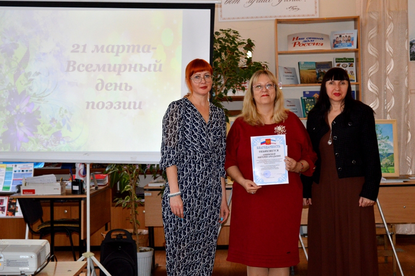 Сотрудники библиотеки выражают огромную благодарность за помощь в организации поэтического конкурса «Золотая россыпь стихов» доценту кафедры русской и украинской филологии Крымского инженерно-педагогического университета имени Февзи Якубова, кандидату филологических наук Екатерине Машковой.